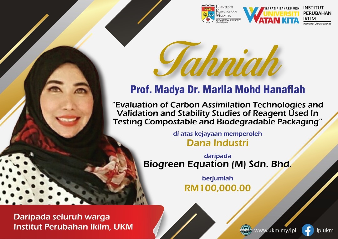 TAHNIAH diucapkan kepada Prof. Madya Dr. Marlia Mohd Hanafiah di atas kejayaan memperoleh geran industri berjumlah RM100 000 daripada syarikat Biogreen Equation (M) Sdn. Bhd.