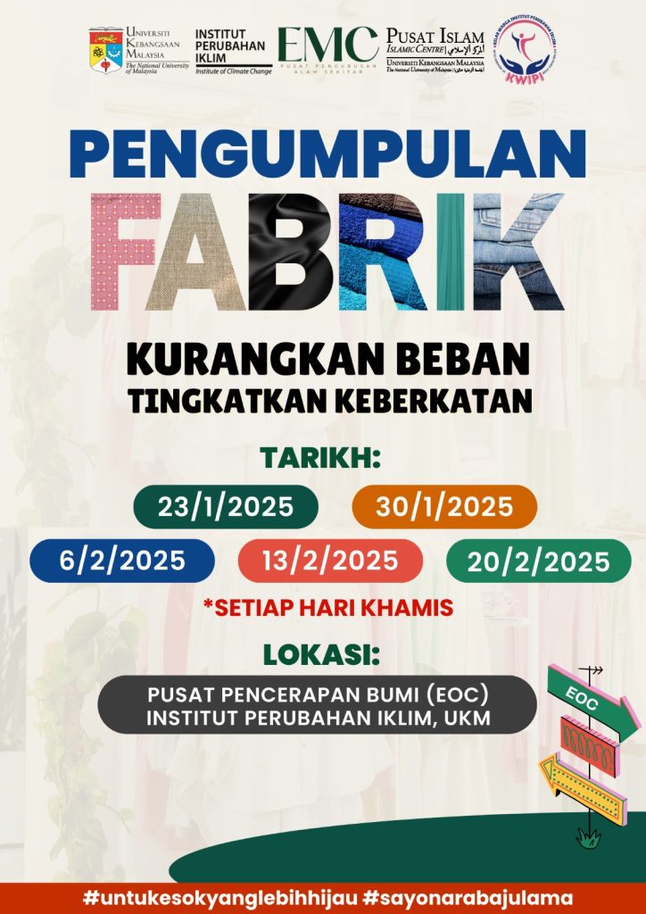 Pusat Pengurusan Alam Sekitar (EMC) dengan kerjasama Pusat Islam UKM dan Kelab Warga Institut Perubahan Iklim (KWIPI) akan mengadakan aktiviti Pengumpulan Fabrik: Kurangkan Beban, Tingkatkan Keberkatan. Sehubungan dengan itu, kami menyeru kepada semua warga UKM Bangi untuk bersama-sama menyumbang pakaian, kasut dan aksesori yang tidak digunakan lagi untuk tujuan amal ini. Setiap sumbangan anda sangat dihargai dan akan memberi manfaat kepada mereka yang memerlukan.