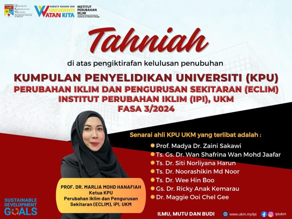 Tahniah diucapkan kepada Prof. Dr. Marlia Mohd Hanafiah di atas penubuhan Kumpulan Penyelidikan Universiti (KPU) baharu. Perubahan Iklim dan Pengurusan Sekitaran (ECLIM).