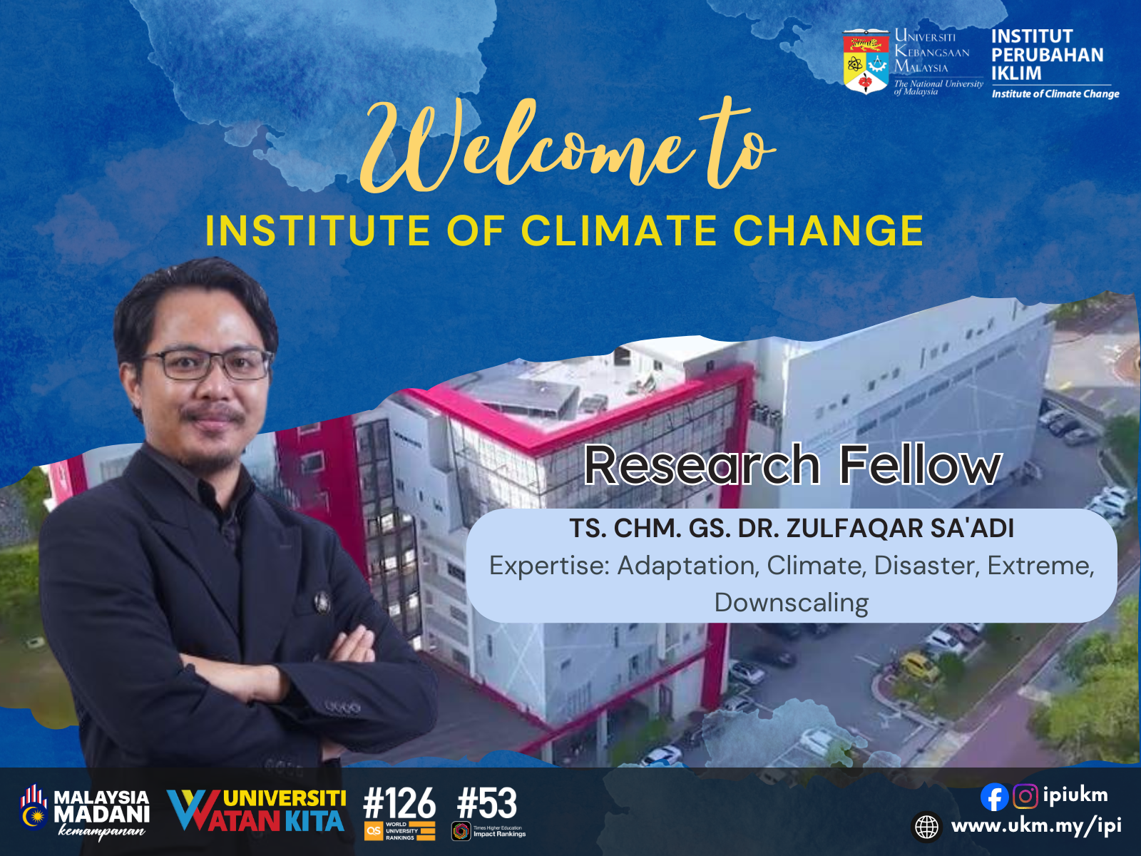 Institut Perubahan Iklim mengalu-alukan kehadiran Ts. ChM. Gs. Dr. Zulfaqar Sa’adi sebagai Felo Penyelidik di Institut Perubahan Iklim, Universiti Kebangsaan Malaysia.