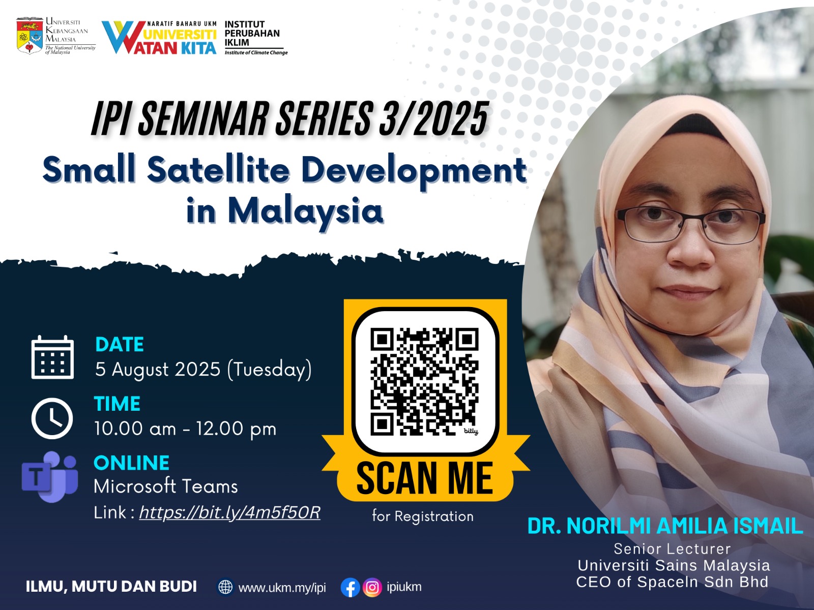 Sukacita dimaklumkan bahawa Institut Perubahan Iklim (IPI), Universiti Kebangsaan Malaysia dengan kerjasama KPU Sains & Teknologi Angkasa UKM akan menganjurkan Siri Seminar IPI 3/2025 secara atas talian yang