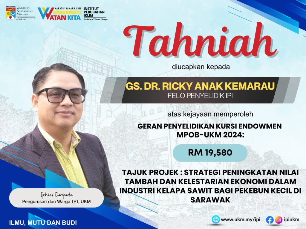 Tahniah! Kejayaan Memperoleh Geran Penyelidikan Kursus Endowmen MPOB-UKM Tahniah diucapkan kepada Gs. Dr. Ricky Anak Kemarau kerana telah berjaya mendapat Geran Penyelidikan Kursus Endowmen MPOB-UKM 2024 berjumlah RM 19580???