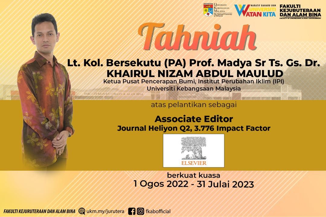 Setinggi-tinggi tahniah diucapkan kepada Prof. Madya Sr. Dr. Khairul Nizam Abdul Maulud, Ketua Pusat Pencerapan Bumi, Institut Perubahan Iklim di atas pelantikan sebagai Associate Editor Journal Heliyon Q2, 3.776 Impact Factor.