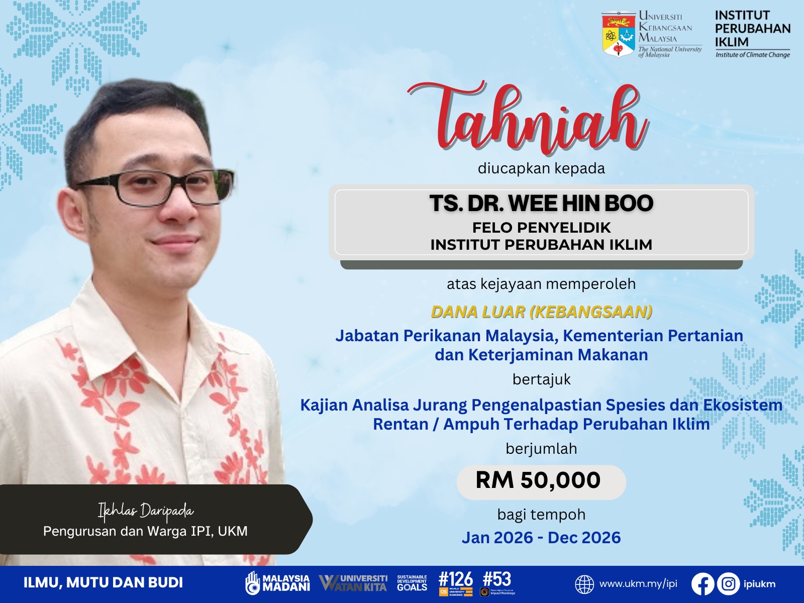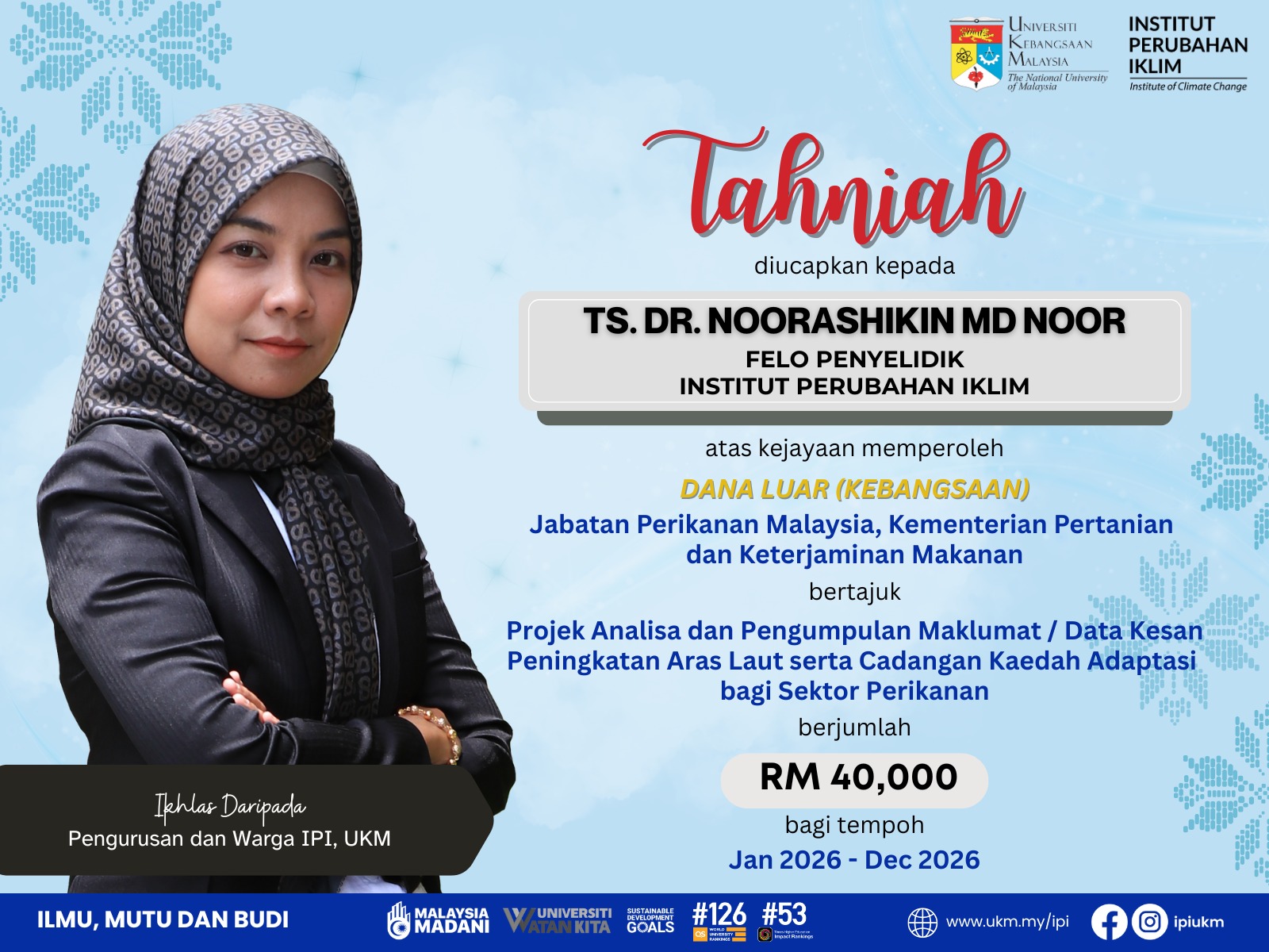 Tahniah diucapkan kepada Ts. Dr. Noorashikin Md Noor dan Ts. Dr. Wee Hin Boo di atas kejayaan memperolehi Dana Luar Kebangsaan daripada Jabatan Perikanan Malaysia.