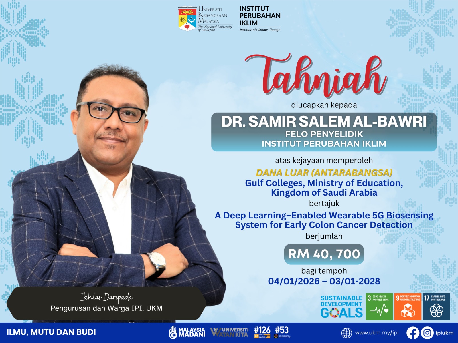 Tahniah diucapkan kepada Dr. Samir Salem Al-Bawri atas kejayaan menerima geran antarabangsa daripada Gulf Colleges, Ministry of Education, Kingdom of Saudi Arabia berjumlah RM40,700 (USD10,000).