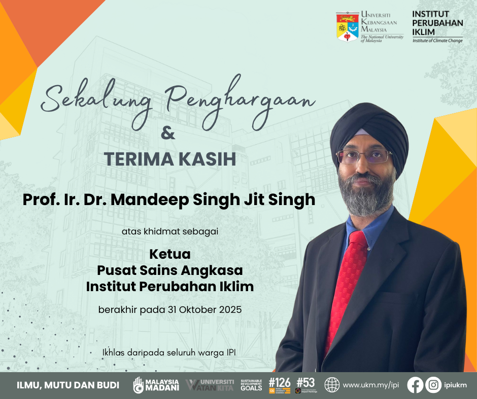 Institut Perubahan Iklim (IPI), Universiti Kebangsaan Malaysia merakamkan setinggi-tinggi penghargaan dan ucapan terima kasih kepada Prof. Ir. Dr. Mandeep Singh Jit Singh atas khidmat bakti, kepimpinan dan sumbangan cemerlang beliau sepanjang tempoh memegang jawatan sebagai Ketua Pusat Sains Angkasa, IPI.