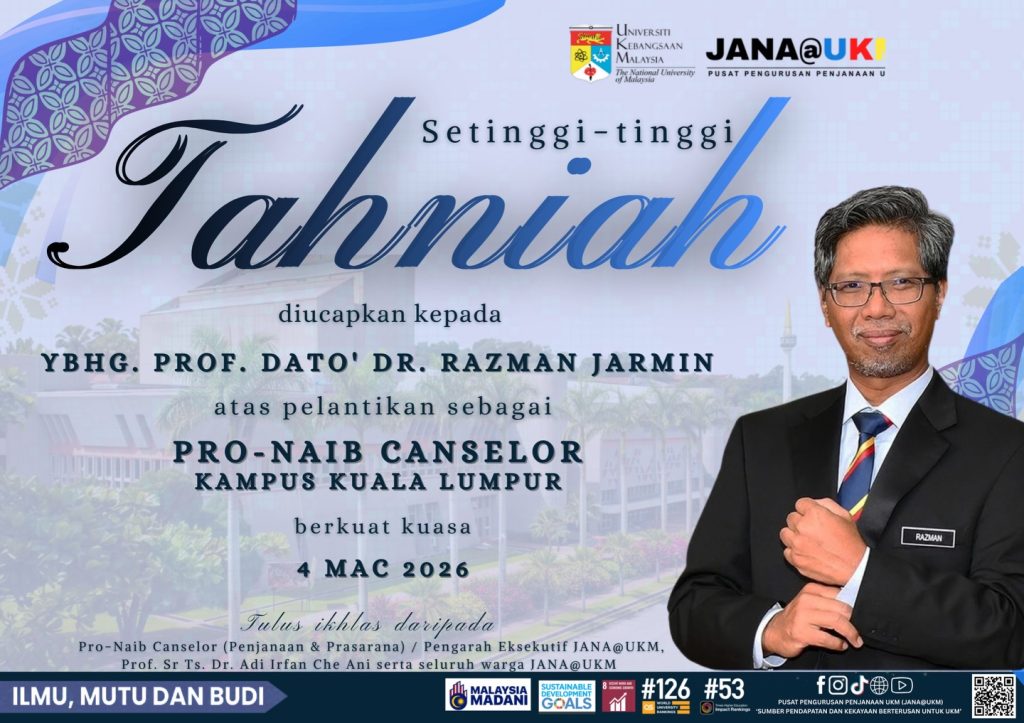 Tulus Ikhlas daripada Pro-Naib Canselor (Penjanaan & Prasarana) / Pengarah Eksekutif JANA@UKM, Prof. Sr Ts. Dr. Adi Irfan Che Ani serta seluruh Warga Pusat Pengurusan Penjanaan UKM (JANA@UKM)