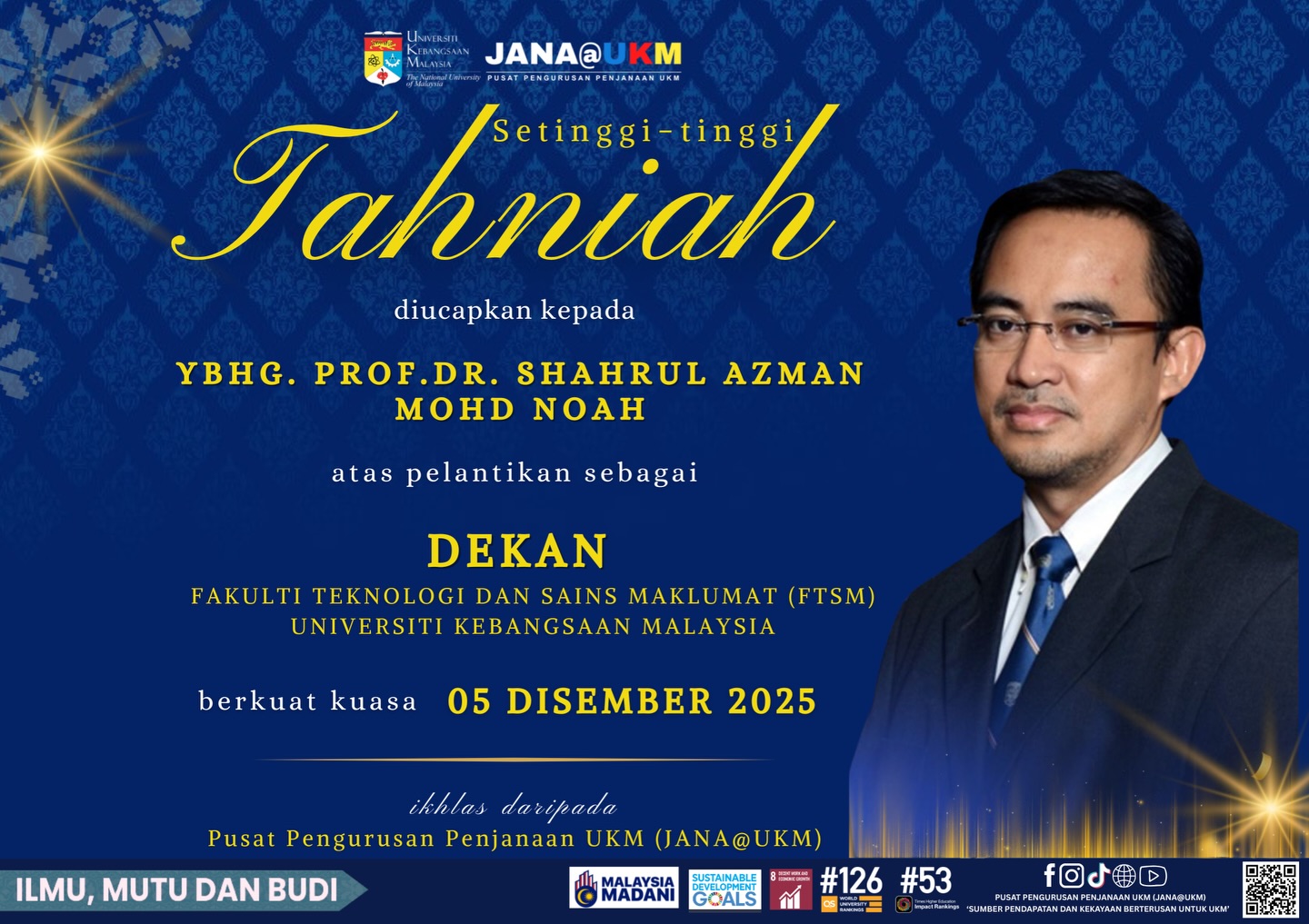 Warga JANA@UKM merakamkan setinggi-tinggi tahniah kepada YBhg. Prof. Dr. Shahrul Azman Mohd Noah atas pelantikan sebagai Dekan Fakulti Teknologi Dan Sains Maklumat (FTSM) UKM yang berkuat kuasa pada 05 Disember 2025.