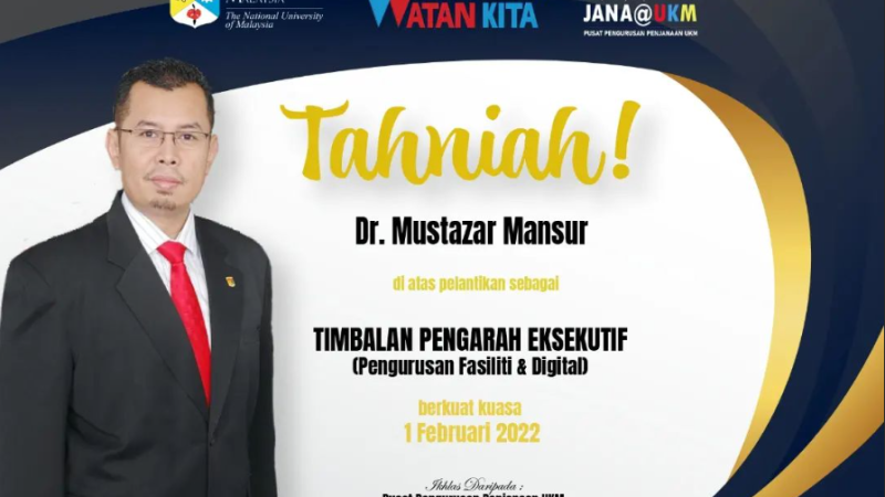 Tahniah di atas pelantikan sebagai Timbalan Pengarah Eksekutif (Pengurusan Fasiliti & Digital) di Pusat Pengurusan Penjanaan UKM (JANA@UKM)