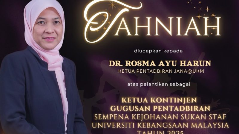 Pusat Pengurusan Penjanaan UKM (JANA@UKM) mengucapkan setinggi-tinggi tahniah kepada Dr. Rosma Ayu Harun, Ketua Pentadbiran JANA@UKM atas pelantikan sebagai Ketua Kontinjen Gugusan Pentadbiran Sempena Kejohanan Sukan Staf Universiti Kebangsaan Malaysia bagi Tahun 2025