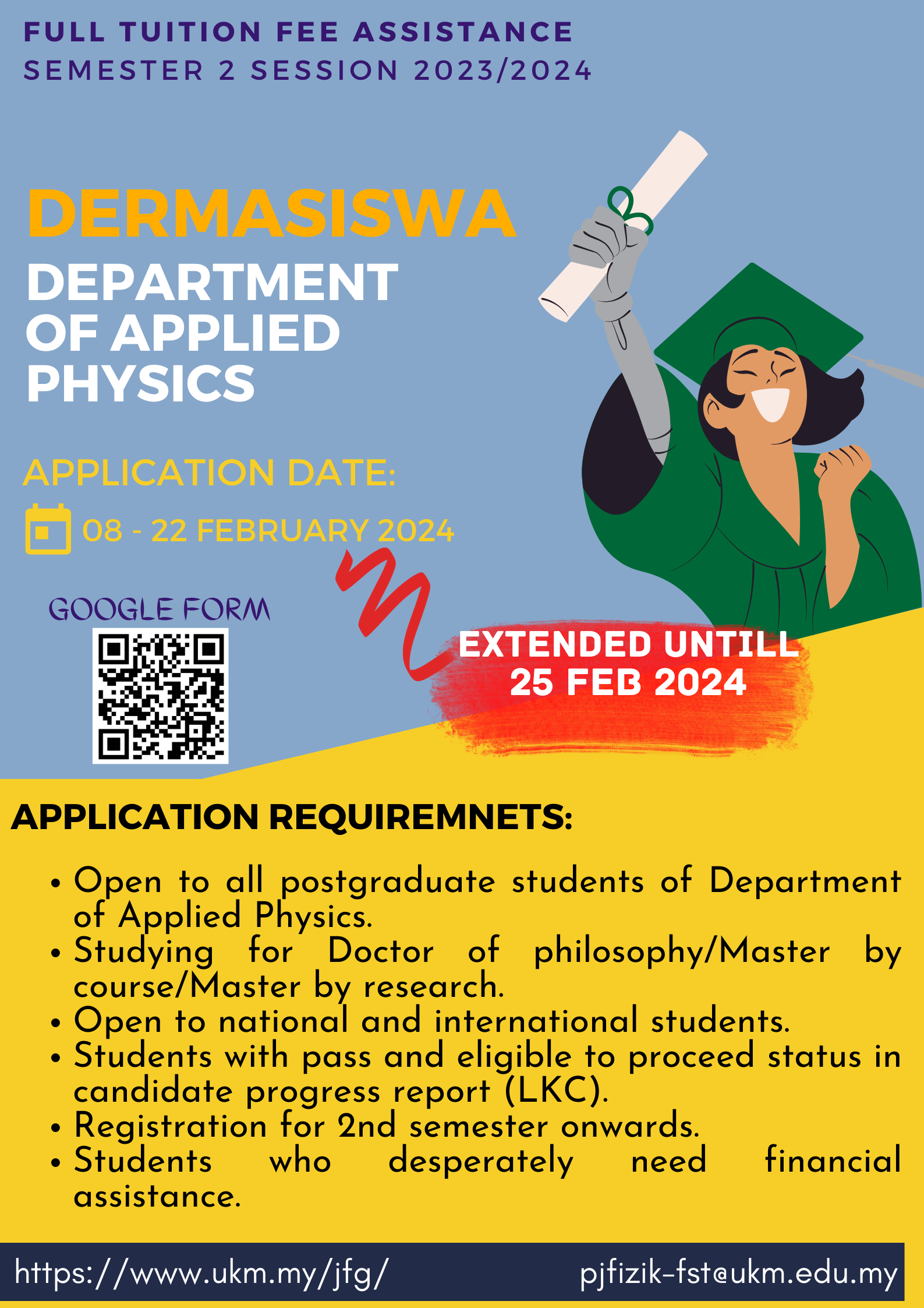 Sukacita dimaklumkan bahawa Permohonan Dermasiswa bagi semester II sesi 2023/2024 dilanjutkan sehingga 25 Februari 2024.