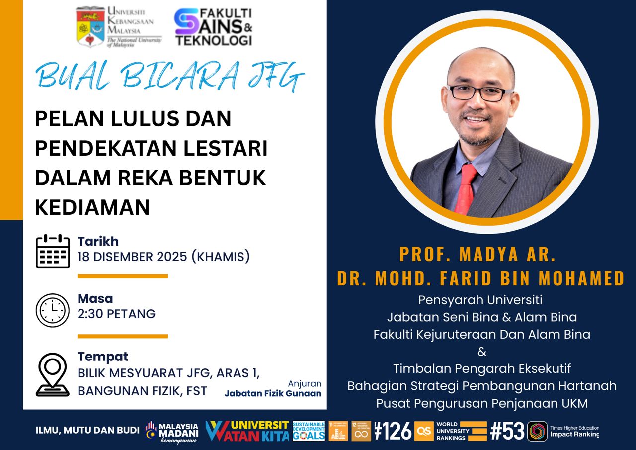 Jemputan Menghadiri Bual Bicara JFG 2025 anjuran Jabatan Fizik Gunaan, Fakulti Sains & Teknologi, UKM