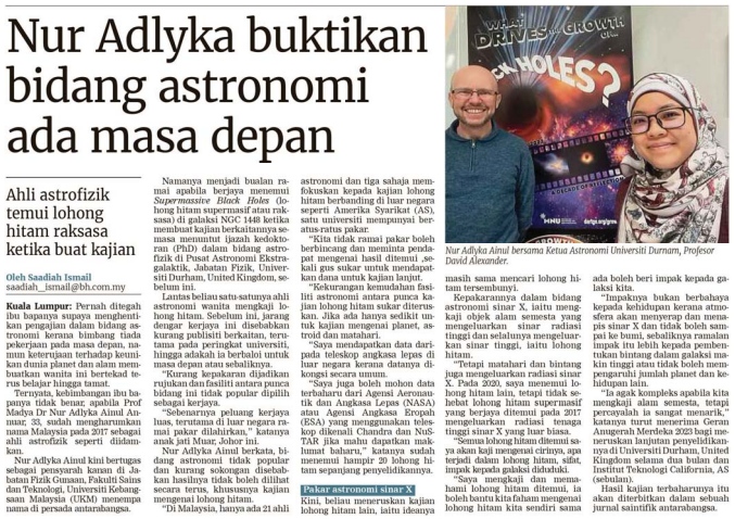 Nur Adlyka Proves Astronomy Has A Future (Berita Harian) – PM Dr. Nur Adlyka Ainul Annuar – FST