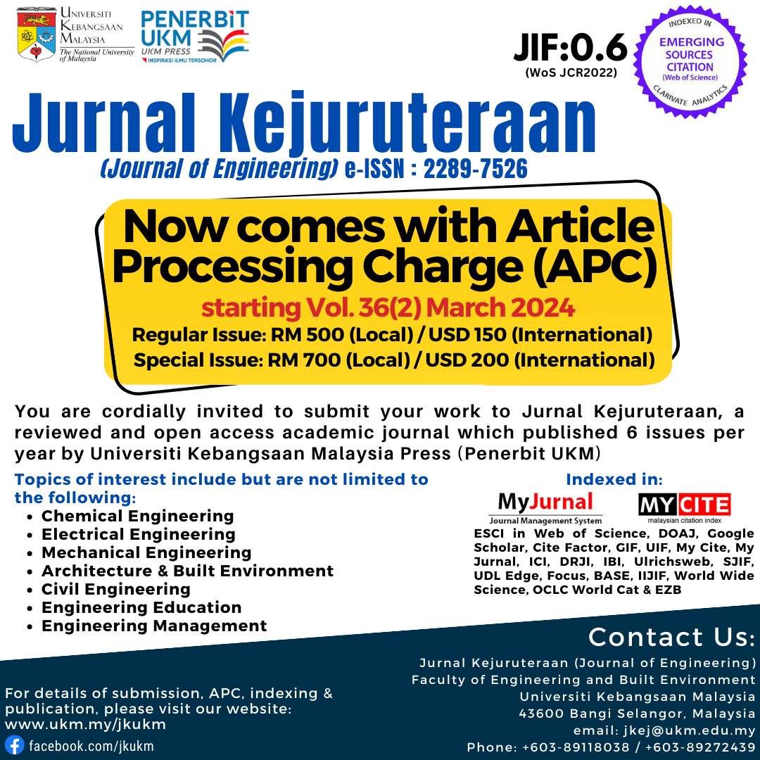 Jurnal Kejuruteraan (Journal of Engineering) is published by UKM Press (Penerbit UKM) of Universiti Kebangsaan Malaysia Publisher. It acts as a forum for the publication of technical (original research) and review papers, subject to Article Processing Charge (APC) in all engineering (Chemical, Civil, Electrical, Mechanical, Engineering Education and Engineering Management) and Built Environment related areas.