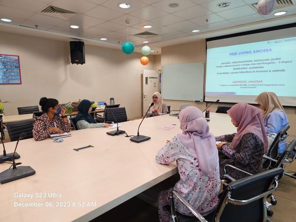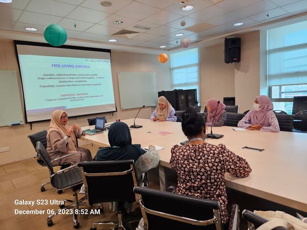 Jabatan mengalu-alukan kehadiran delegasi daripada Institut Kanser Negara yang hadir untuk tujuan lawatan kerja dan latihan teknik pengkulturan Acanthamoeba pada 6 Disember 2023. Mereka adalah:
