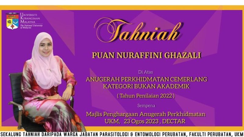 TAHNIAH Jabatan merakamkan jutaan tahniah kepada Puan Nuraffini Ghazali kerana memperoleh Anugerah Perkhidmatan Cemerlang (Kategori Bukan Akademik) bagi tahun penilaian 2022 sempena Majlis Penghargaan Anugerah …