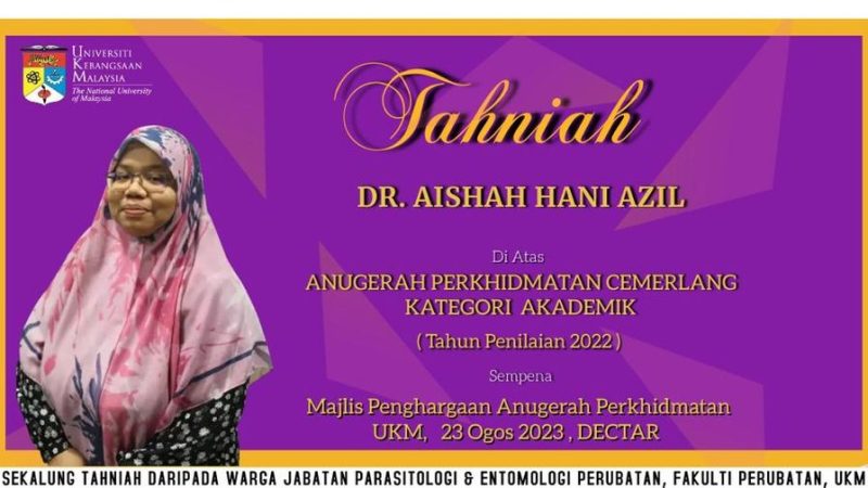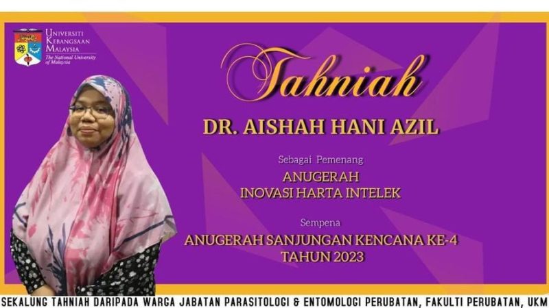 TAHNIAH Jabatan Parasitologi & Entomologi Perubatan merakamkan ucapan syabas dan tahniah kepada Dr. Aishah Hani Azil sebagai Pemenang Anugerah Harta Intelek sempena Anugerah Sanjungan Kencana …