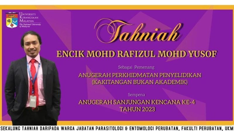 TAHNIAH Jabatan Parasitologi & Entomologi Perubatan merakamkan ucapan syabas dan tahniah kepada En. Mohd Rafizul Mohd Yusof sebagai Pemenang Anugerah Perkhidmatan Penyelidikan (Kakitangan Bukan Akademik) …