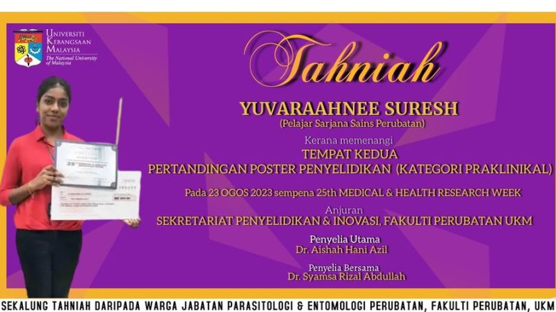 TAHNIAH Jabatan merakamkan ucapan tahniah kepada Puan Yuvaraahnee Suresh atas kejayaan memenangi tempat ke-2 Pertandingan Poster Penyelidikan (Kategori Praklinikal) sempena Minggu Penyelidikan Perubatan & Kesihatan …