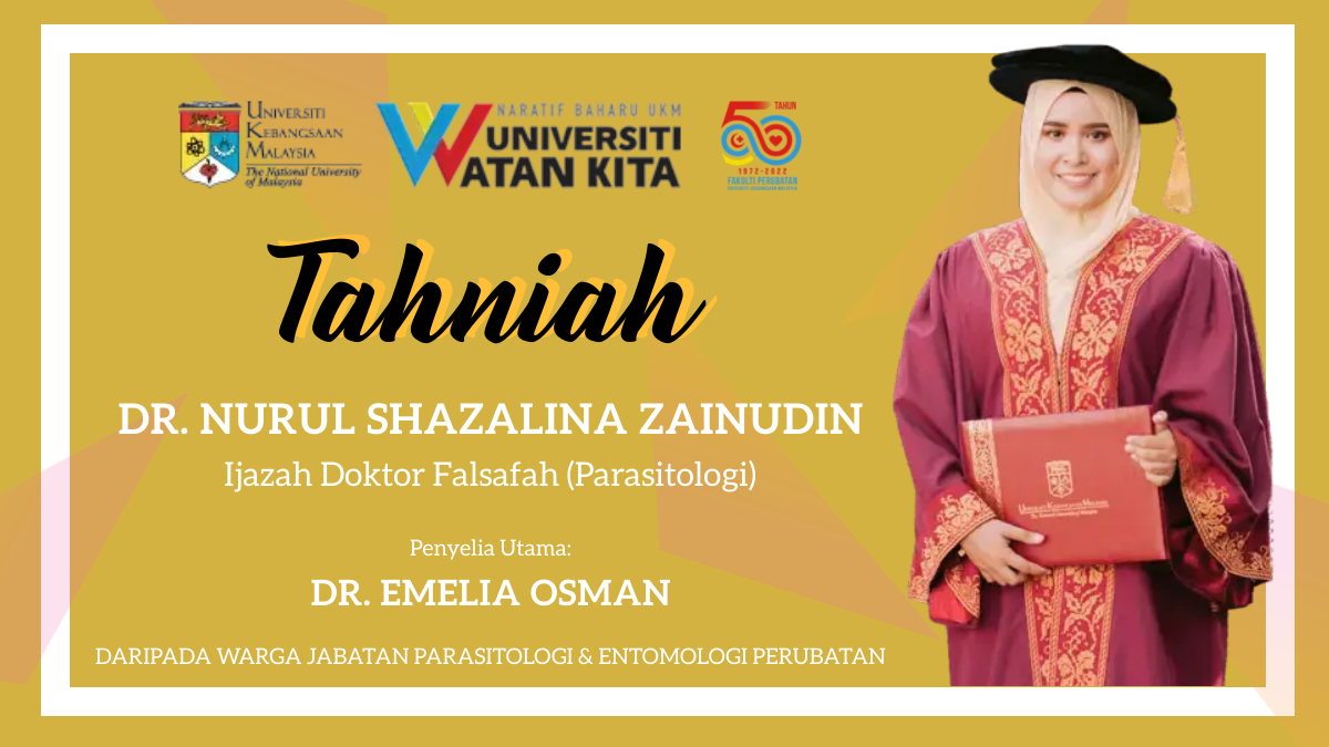 Sekalung tahniah diucapkan kepada Dr(PhD). Nurul Shazalina Zainudin, graduan Ijazah Doktor Falsafah (Parasitologi) yang telah bergraduasi di Majlis Konvokesyen UKM Ke-49 (Sidang Pertama) pada …