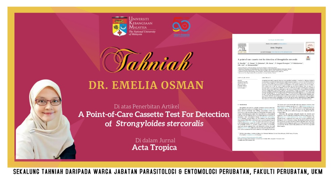 Sekalung penghargaan dan ucapan tahniah diucapkan kepada Dr. Emelia Osman, Pensyarah Jabatan di atas penerbitan jurnal beliau yang bertajuk “A Point-of-care Cassette Test for Detection …