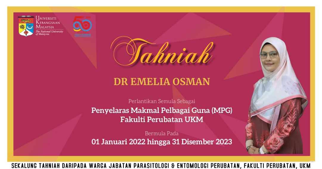 Jabatan Parasitologi & Entomologi Perubatan merakamkan ucapan syabas dan tahniah kepada Dr. Emelia Osman, Pensyarah Jabatan di atas pelantikan semula sebagai Penyelaras Makmal Pelbagai Guna, …