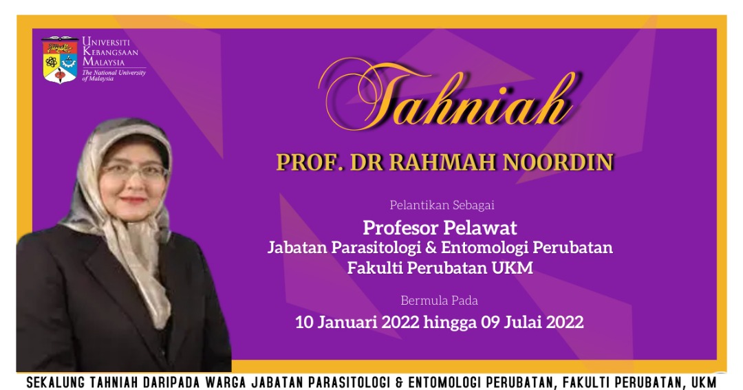 Sekalung tahniah diucapkan kepada Profesor Dr, Rahmah Noordin di atas pelantikan sebagai Profesor Pelawat di Jabatan Parasitologi & Entomologi Perubatan yang mula berkuatkuasa pada 10 …