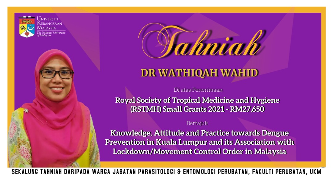 Jabatan Parasitologi & Entomologi Perubatan merakamkan setinggi-tinggi penghargaan dan tahniah kepada Dr.Wathiqah Wahid sebagai penerima Royal Society of Tropical Medicine and Hygiene (RSTMG) Small Grant …