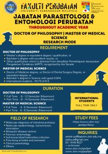 Jabatan Parasitologi dan Entomologi Perubatan mengalu-alukan permohonan anda untuk menjadi sebahagian daripada pelajar kami. Permohonan dibuka sepanjang tahun.
