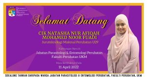 Selamat datang dan selamat bertugas diucapkan kepada kakitangan baru, Cik Natasha Nur Afiqah Mohamed Noor Fuadi (Juruteknologi Makmal Perubatan U29) ke Jabatan Parasitologi & Entomologi Perubatan.