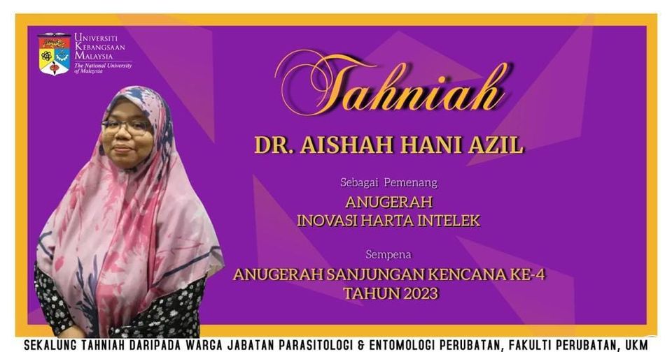 Jabatan Parasitologi & Entomologi Perubatan merakamkan ucapan syabas dan tahniah kepada Dr. Aishah Hani Azil sebagai Pemenang Anugerah Harta Intelek sempena Anugerah Sanjungan Kencana Ke - 4, Fakulti Perubatan.