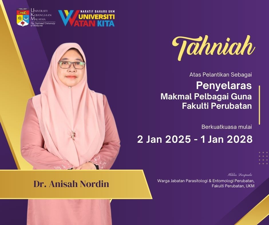 TAHNIAH - Dr. Anisah Nordin Jabatan mengucapkan setinggi-tinggi tahniah kepada Dr. Anisah Nordin di atas pelantikan sebagai Penyelaras Makmal Pelbagai Guna, Fakulti Perubatan UKM berkuatkuasa 2 Januari 2025 sehingga 1 Januari 2028. Tahniah!