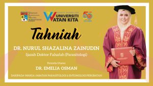 Sekalung tahniah diucapkan kepada Dr(PhD). Nurul Shazalina Zainudin, graduan Ijazah Doktor Falsafah (Parasitologi) yang telah bergraduasi di Majlis Konvokesyen UKM Ke-49 (Sidang Pertama) pada Ahad, 28 November 2021.