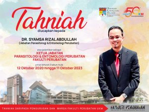 Glad to be informed Dr. Syamsa Rizal Abdullah has been appointed as the Head of the Department of Parasitology & Medical Entomology replacing Dr. ‘Azlin Muhammad @ Mohd Yassin effective from 12th October 2020 to 11th October 2023.