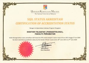 Sekalung penghargaan dan ucapan tahniah diucapkan kepada Jabatan Parasitologi & Entomologi Perubatan UKM, di atas penganugerahan Sijil Status Akreditasi bagi Program Pengajian Doktor Falsafah (Parasitologi) Fakulti Perubatan.