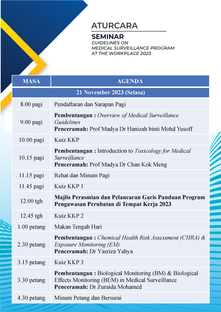 - Untuk mempromosikan Garis Panduan Program Pengawasan Perubatan (Guidelines on Medical Surveillance) 2023 berdasarkan perkembangan dan bukti saintifik semasa.