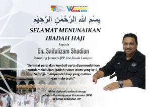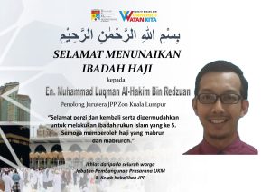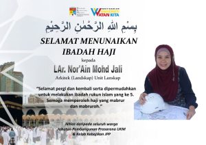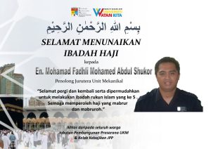 Seluruh warga Jabatan Pembangunan Prasarana UKM dan Kelab Kebajikan JPP ingin mengucapkan tahniah dan Selamat Menunaikan Ibadah Haji kepada LAr. Nor’Ain Mohd Jali, Ketua Unit Landskap, En Saifulizam Shadilan, Penolong Jurutera JPP Zon Kuala Lumpur, En Muhammad Lukman Al-Hakim Bin Redzuan, Penolong Jurutera JPP Zon Kuala Lumpur, dan En. Mohamad Fadhli Mohamed Abdul Shukor, Penolong Jurutera Unit Mekanikal.