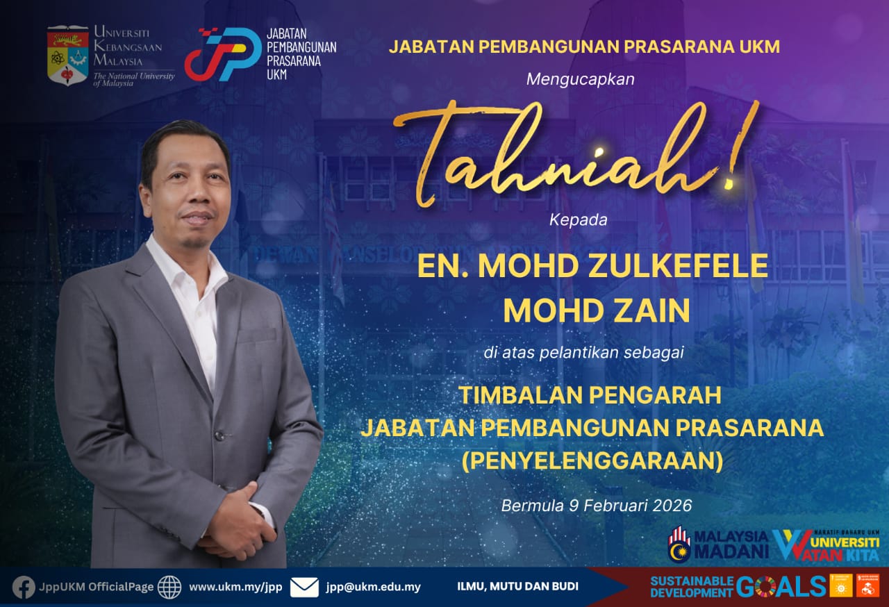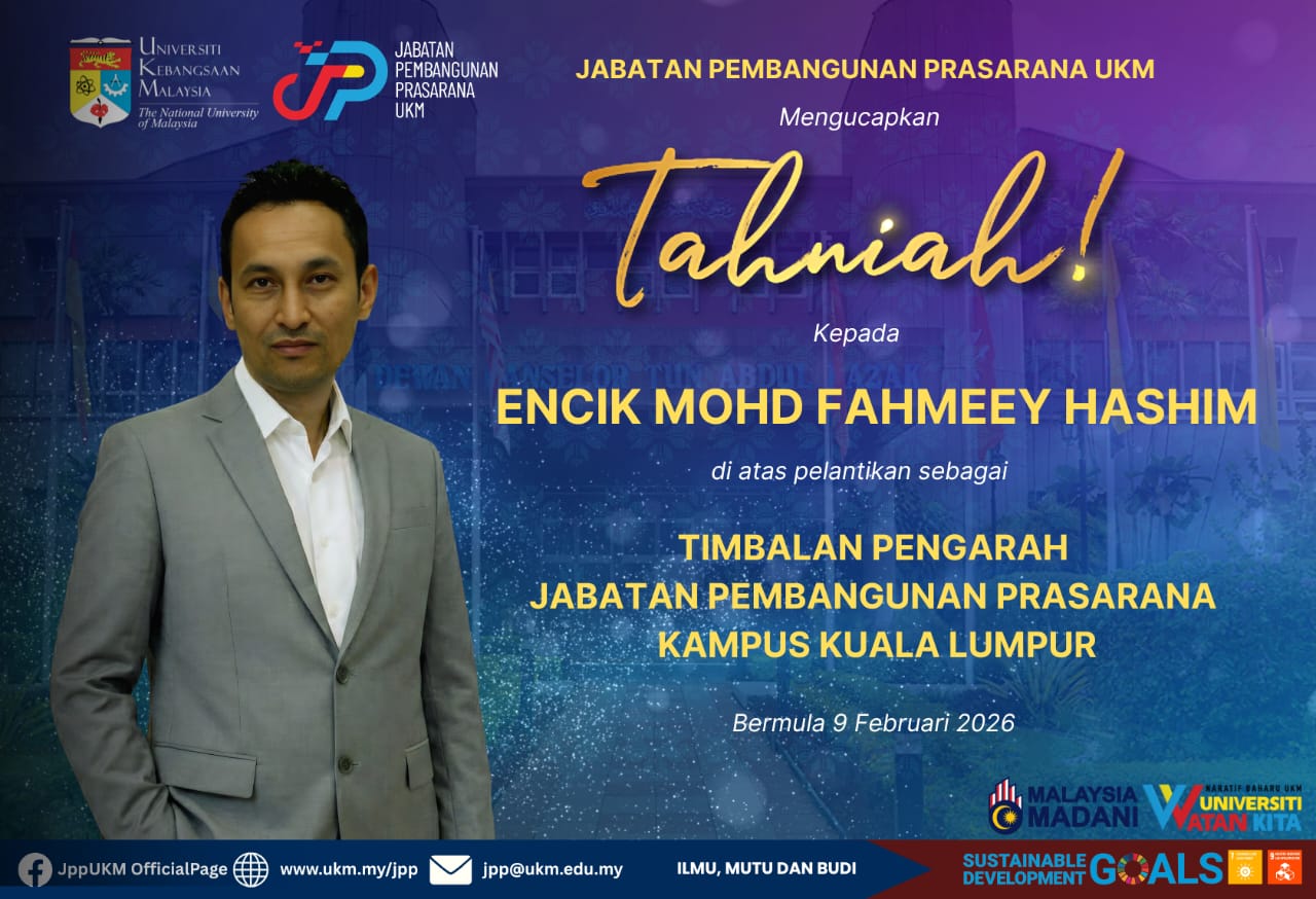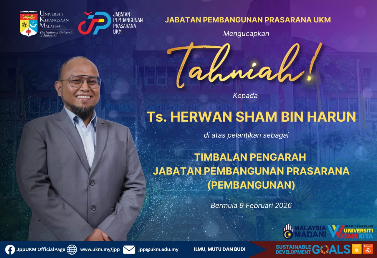 Setinggi-tinggi tahniah diucapkan atas pelantikan sebagai Timbalan Pengarah Jabatan Pembangunan Prasarana (JPP) UKM berkuatkuasa bermula 9 Februari 2026