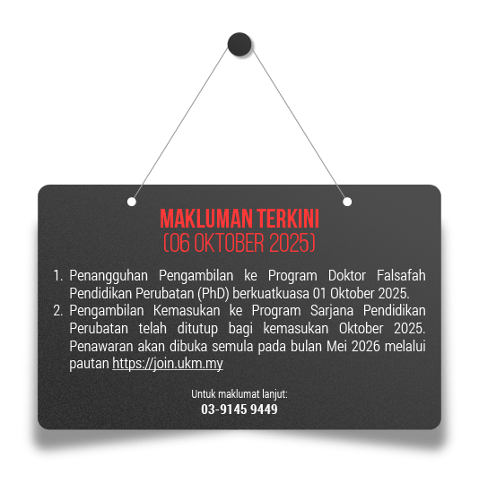 Ijazah Sarjana dari Universiti Kebangsaan Malaysia (UKM) atau mana-mana institusi pengajian tinggi yang setaraf atau ijazah setaraf dari mana-mana institusi yang diiktiraf oleh Senat