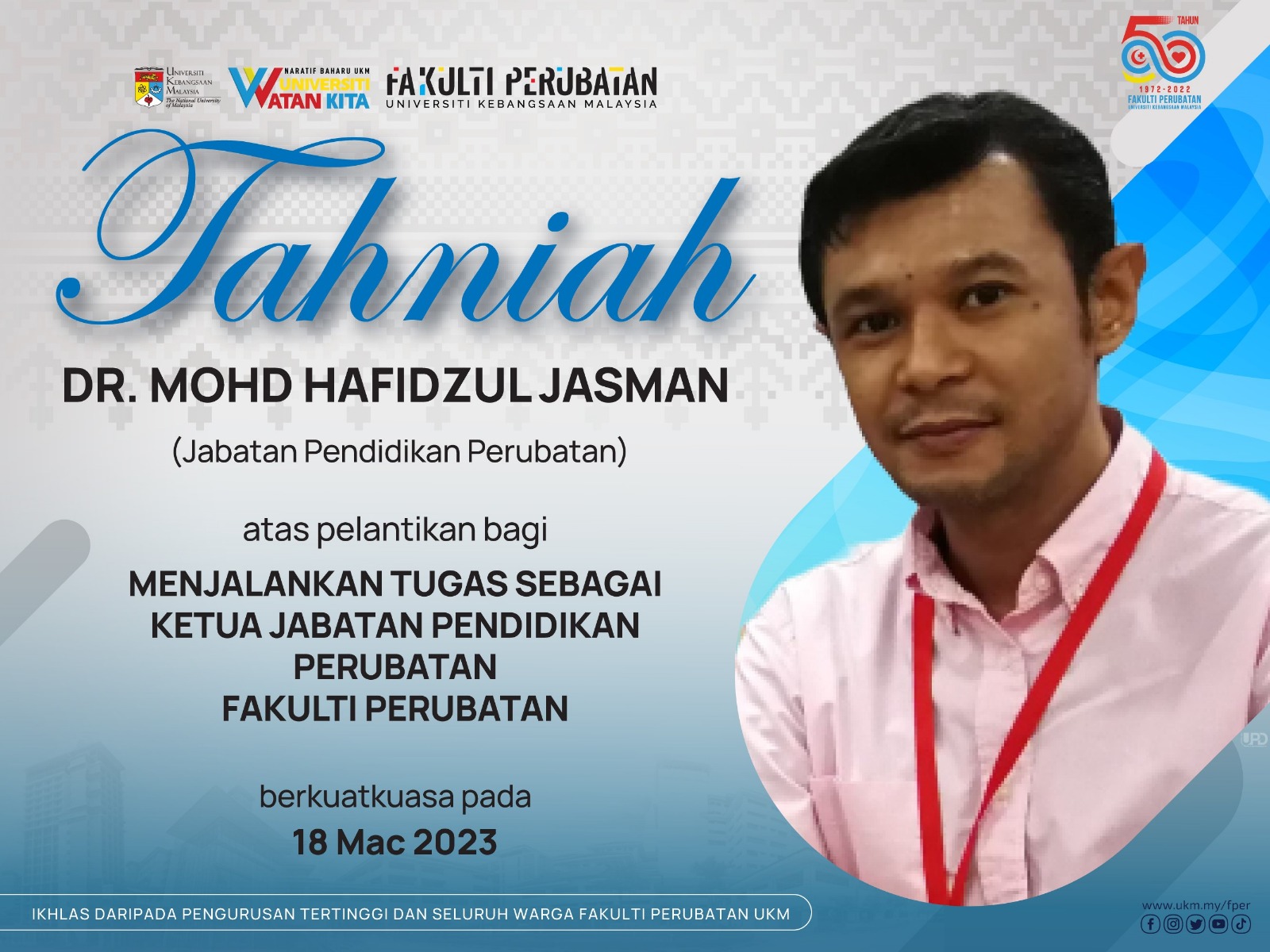 Adalah dimaklumkan bahawa Dr. Mohd Hafidzul Jasman telah dilantik untuk Menjalankan Tugas Ketua Jabatan Pendidikan Perubatan, Fakulti Perubatan UKM berkuatkuasa pada 18 Mac 2023.