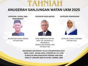 Tahniah atas penganugerahan Anugerah Sanjungan Watan UKM 2025 pada 27 Januari 2026. Anugerah tersebut disampaikan oleh Ybhg. Dato’ Johan Idris, Pengerusi LPU UKM.