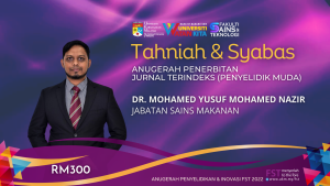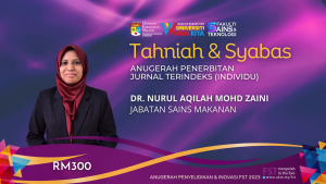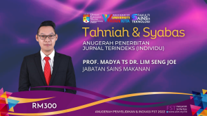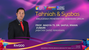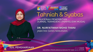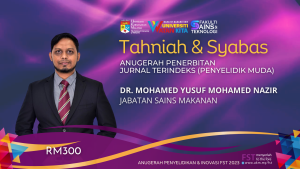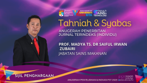 Tahniah diucapkan kepada semua penerima Anugerah Penyelidikan dan Inovasi FST bagi tahun 2022 dan 2023, Jabatan Sains Makanan yang telah disampaikan bersempena Majlis Perhimpunan Warga FST Bersama Dekan 2024 pada 29 Februari 2024 di Dewan Persidangan FST, UKM.
