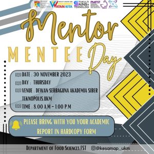 The mentor and mentee meeting session between lecturers of the Department of Food Science, UKM and students from the Food Science and Nutrition Program and students from the Food Science and Business Management Program was successfully held on 30 November 2023 at the Dewan Serbaguna Akademia Siber Teknopolis, UKM.