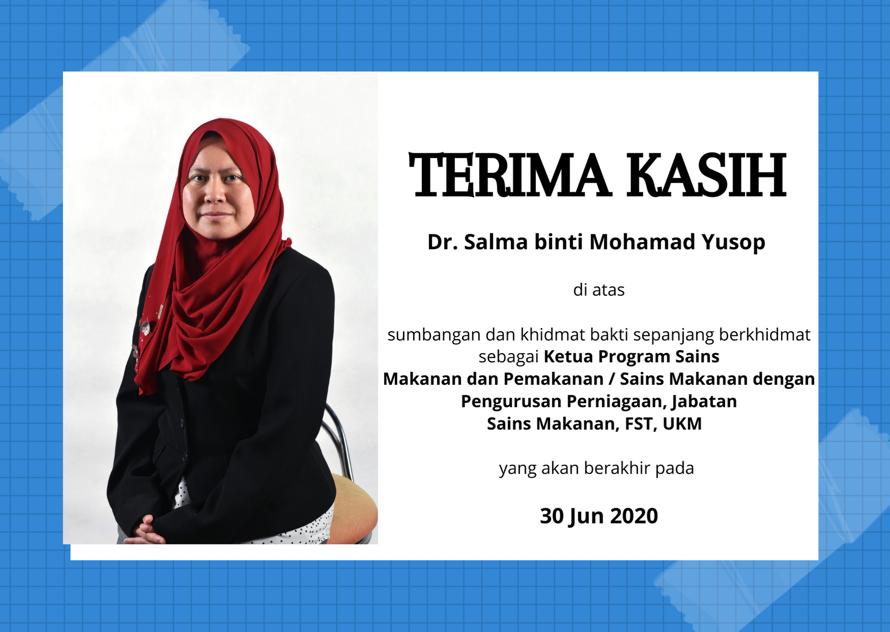 TERIMA KASIH Terima Kasih diucapkan kepada Dr Salma binti Mohamad Yusop di atas sumbangan dan khidmat bakti sepanjang berkhidmat sebagai Ketua Program Sains Makanan …