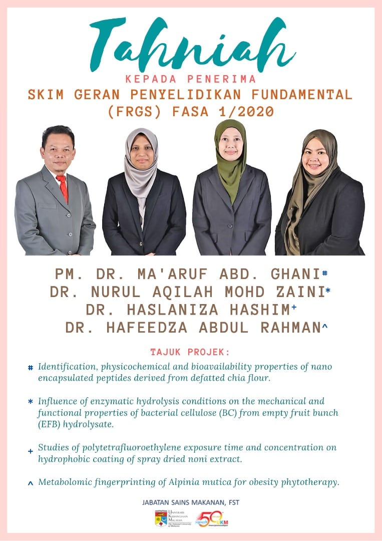 Sekalung tahniah diucapkan kepada penyelidik – penyelidik dari Jabatan Sains Makanan kerana telah berjaya menerima Fundamental Research Grant Scheme (FRGS), Kementerian Pendidikan Tinggi, Fasa 1/2020. …