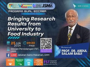 Program Bual Bicara Jabatan Sains Makanan Siri 1/2024 telah diadakan secara hibrid pada 25 Jun 2024 (Selasa) di Dewan Persidangan Fakulti Sains dan Teknologi, UKM dan secara langsung di Facebook Jabatan Sains Makanan, UKM.