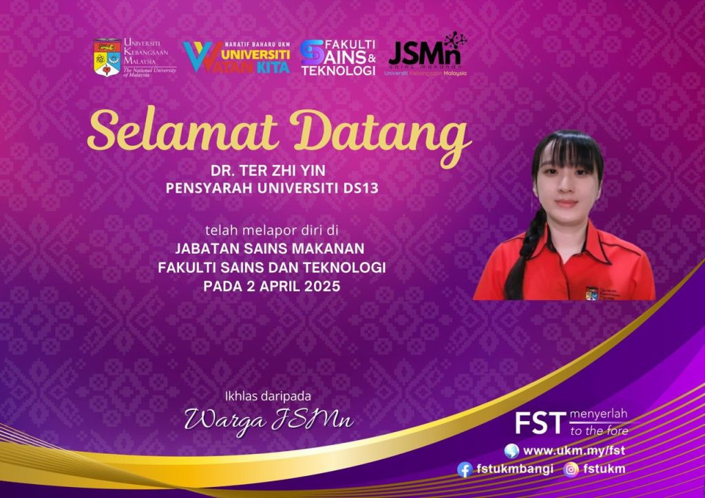 Ucapan tahniah dan selamat datang diucapkan kepada Dr Ter Zhi Yin, Pensyarah Universiti DS13 ke Jabatan Sains Makanan.