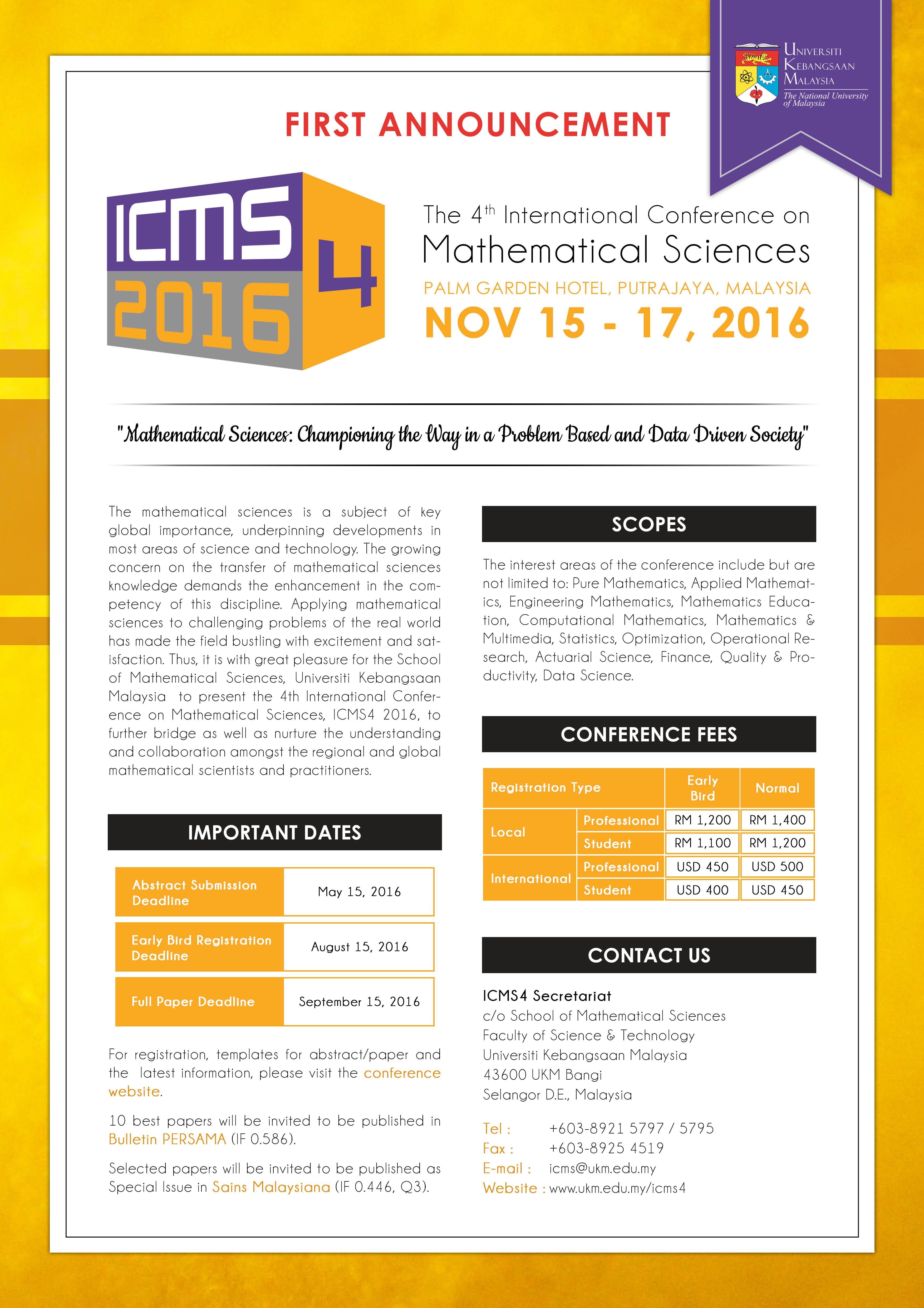 The mathematical sciences is a subject of key global importance, underpinning developments in most areas of science and technology. The growing concern on the transfer of mathematical sciences knowledge demands the enhancement in the competency of this discipline. Applying mathematical sciences to challenging problems of the real world has made the field bustling with excitement and satisfaction. Thus, it is with great pleasure for the School of Mathematical Sciences, Universiti Kebangsaan Malaysia, to present the 4th International Conference on Mathematical Sciences, ICMS4 2016, to further bridge as well as nurture the understanding and collaboration amongst the regional and global mathematical scientists and practitioners.