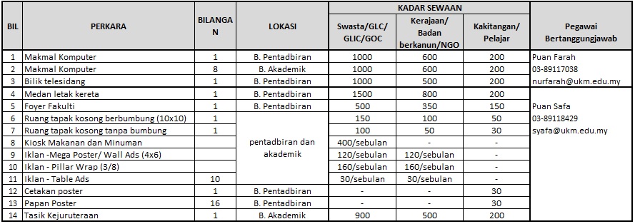 - Kakitangan/Pelajar – Kadar hanya dikenakan kepada para kakitangan/pelajar yang menganjurkan program bersifat keuntungan