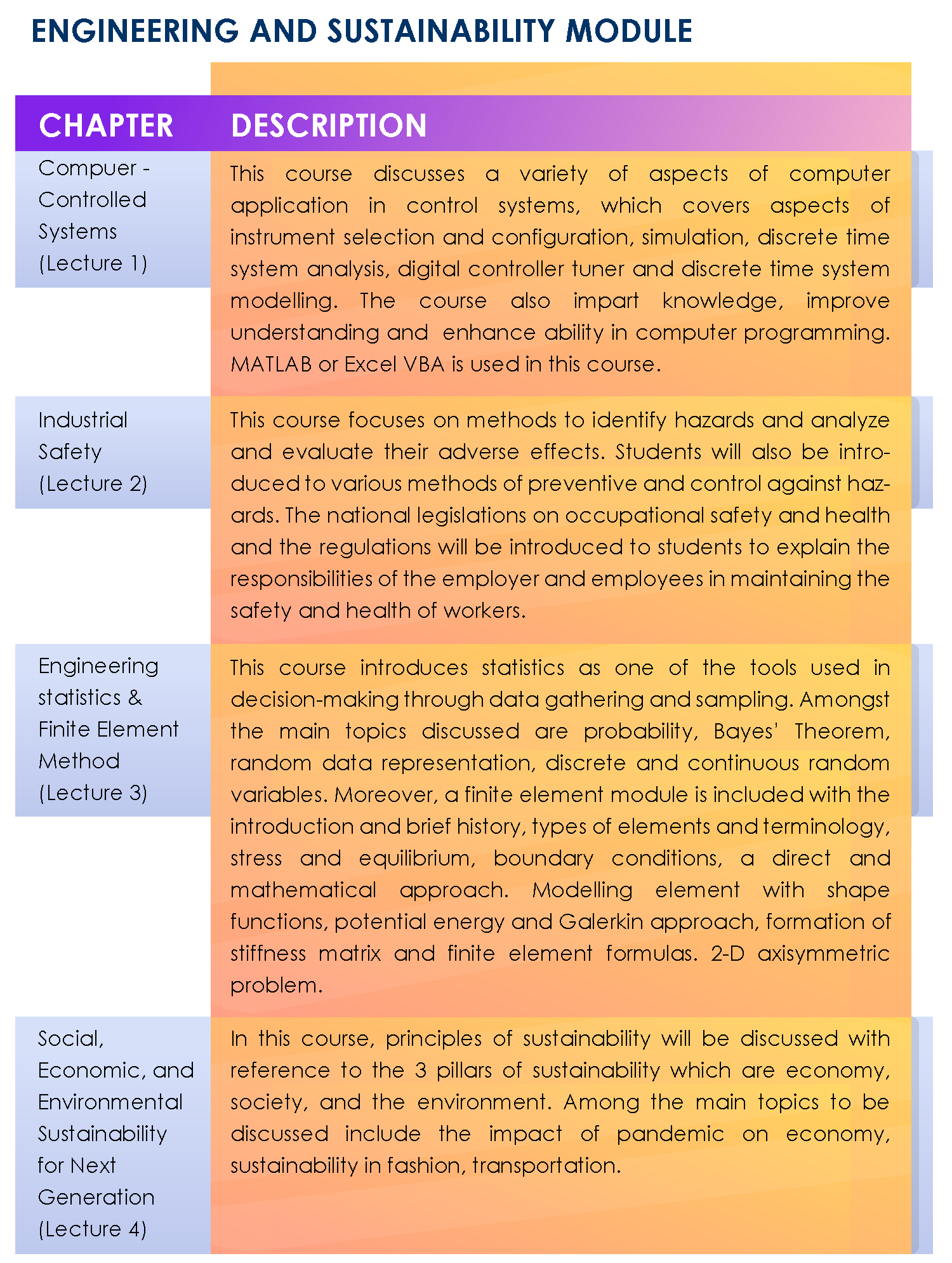 Sekolah Musim Panas Kejuruteraan & Kelestarian (ES3) ialah program 2 minggu yang berlangsung di Fakulti Kejuruteraan dan Alam Bina, Universiti Kebangsaan Malaysia. Para pelajar akan dapat merasai aktiviti berilmu dan menyeronokkan yang ditawarkan. Modul Kejuruteraan dan Kelestarian 12 jam tanpa kredit perlu diambil sepanjang program bersama-sama dengan banyak lawatan ke pameran dan kedai tempatan, lawatan persiaran, dan permainan menarik untuk dimainkan. Dengan menyertai sekolah musim panas ini, para pelajar boleh mempelajari lebih lanjut tentang budaya Malaysia, pendedahan kepada warisan serta berinteraksi dengan masyarakat tempatan.